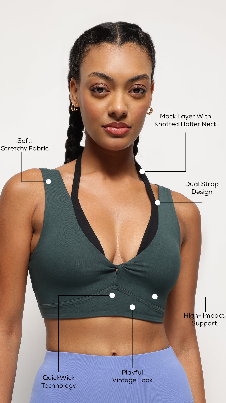 Play boldly. Train securely.This high-impact sports bra reimagines court style with its knotted halter-neck feature, dual straps, and vintage-inspired neckline. Engineered for both performance and personality, it delivers reliable support while adding a playful twist to your active look. Key Features: Mock Layer with