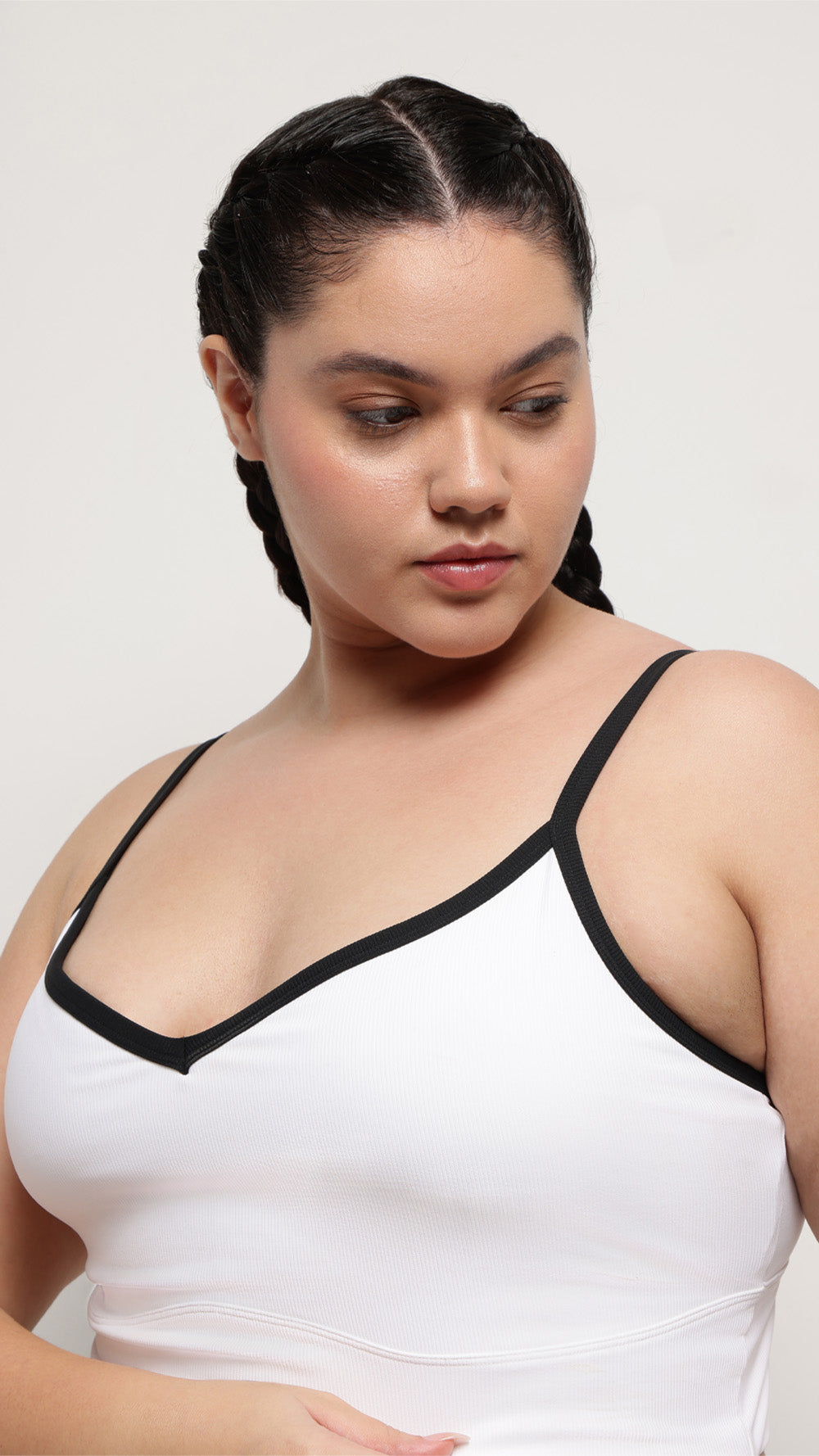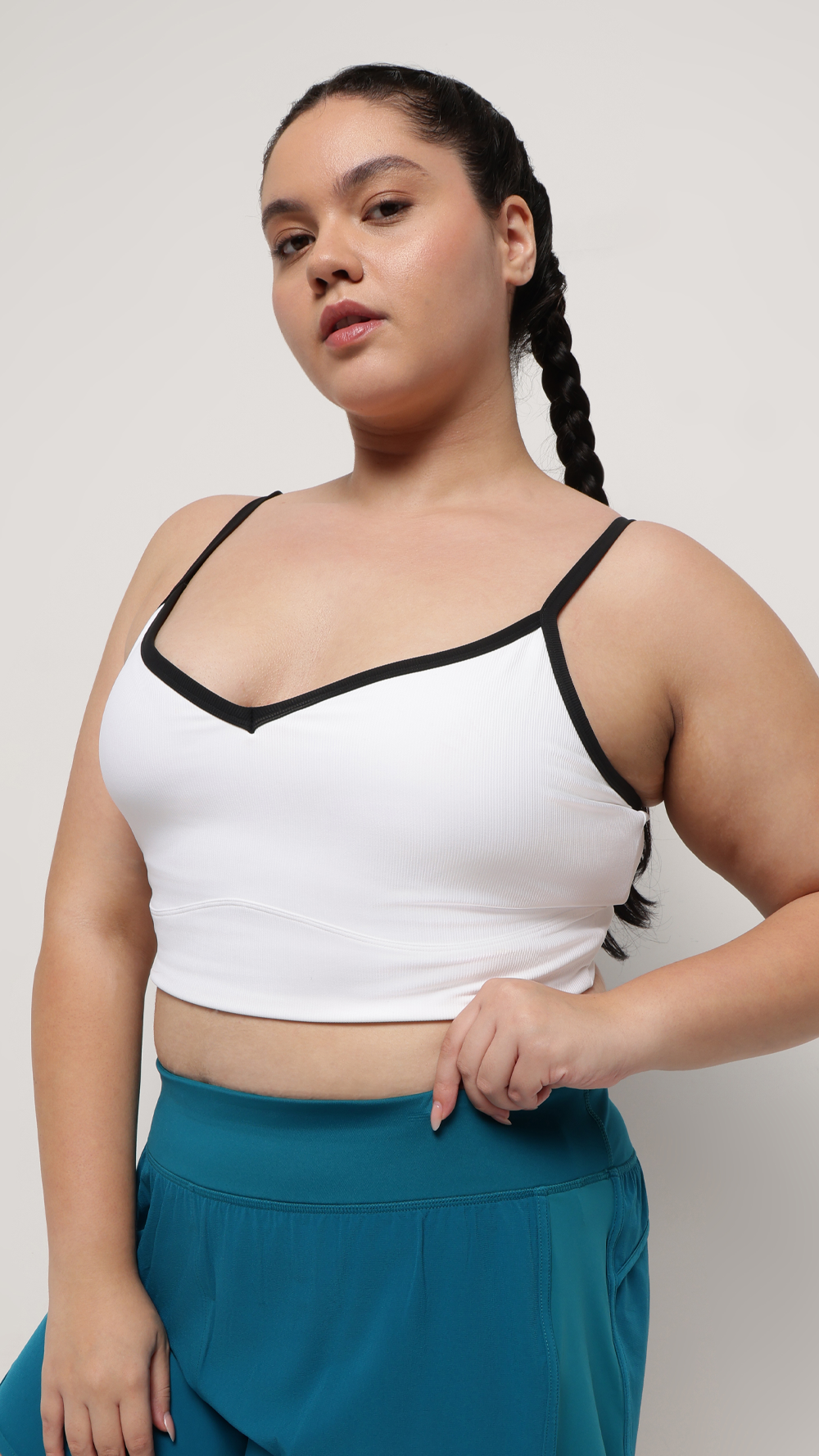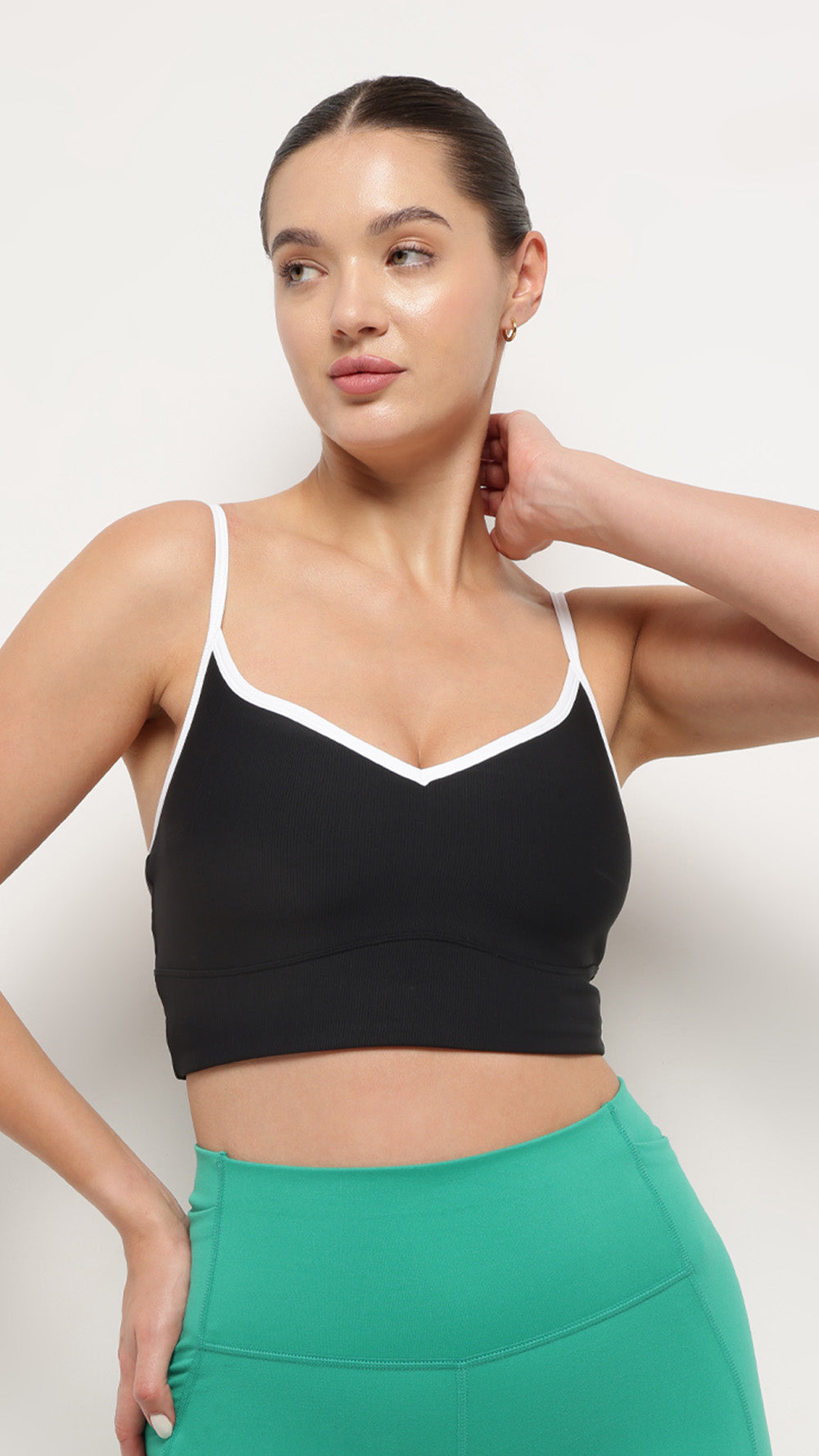 Where elegance meets activewear. This ribbed sweetheart-neck sports bra redefines light support with feminine detailing. Featuring adjustable slender straps, contrast piping, and a supportive band, this elegant black sports bra balances grace with practicality. Key Features: - Sweetheart Neckline for a refined silhouet